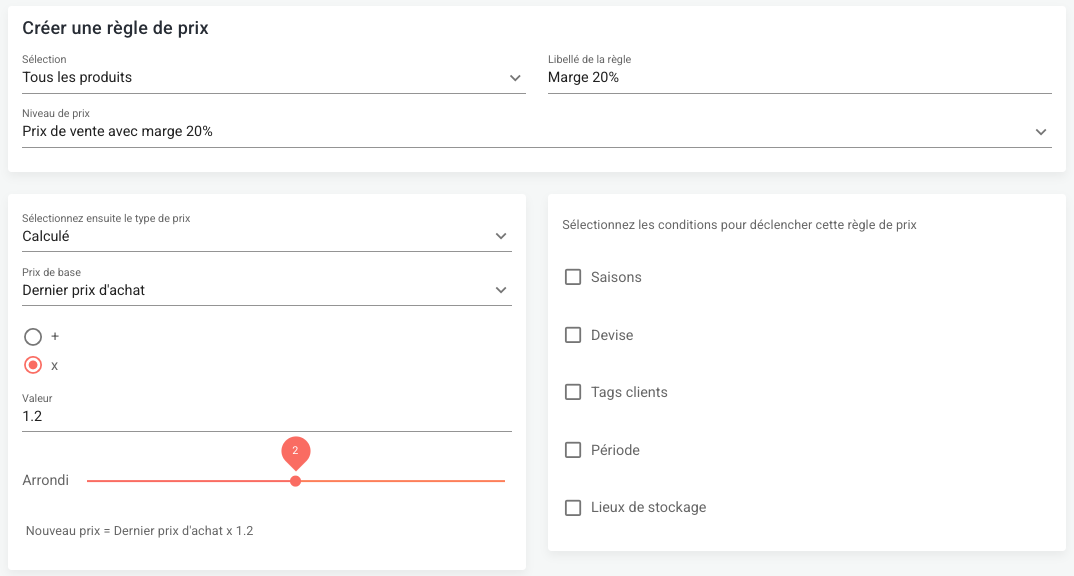 Créer une règle de prix basée sur le dernier prix d'achat avec une marge de 20 % :
