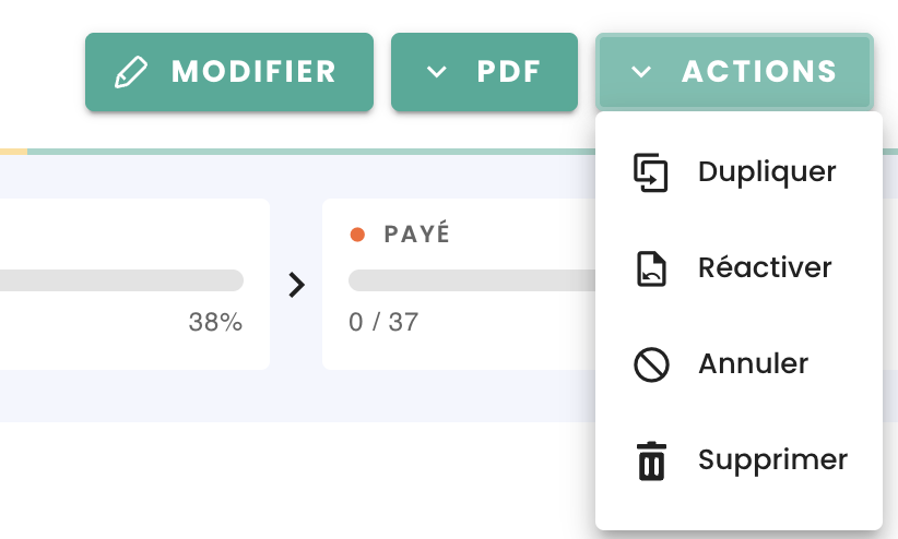 Suite à la réactivation, vous pourrez à nouveau créer des documents depuis le bon de commande ou l'ordre d'achat. Il vous sera également possible d'ajouter de nouveaux paiements depuis la facture (si celle-ci ex