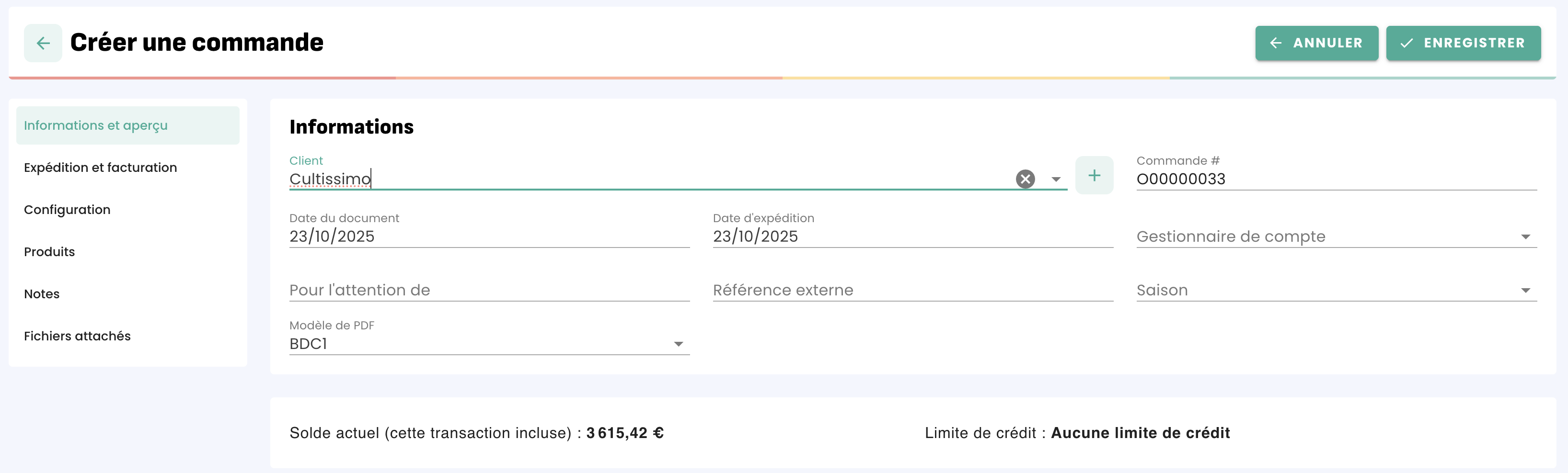 Lorsque vous créez un bon de commande ou une facture, vous verrez le solde actuel juste en dessous du client sélectionné :
