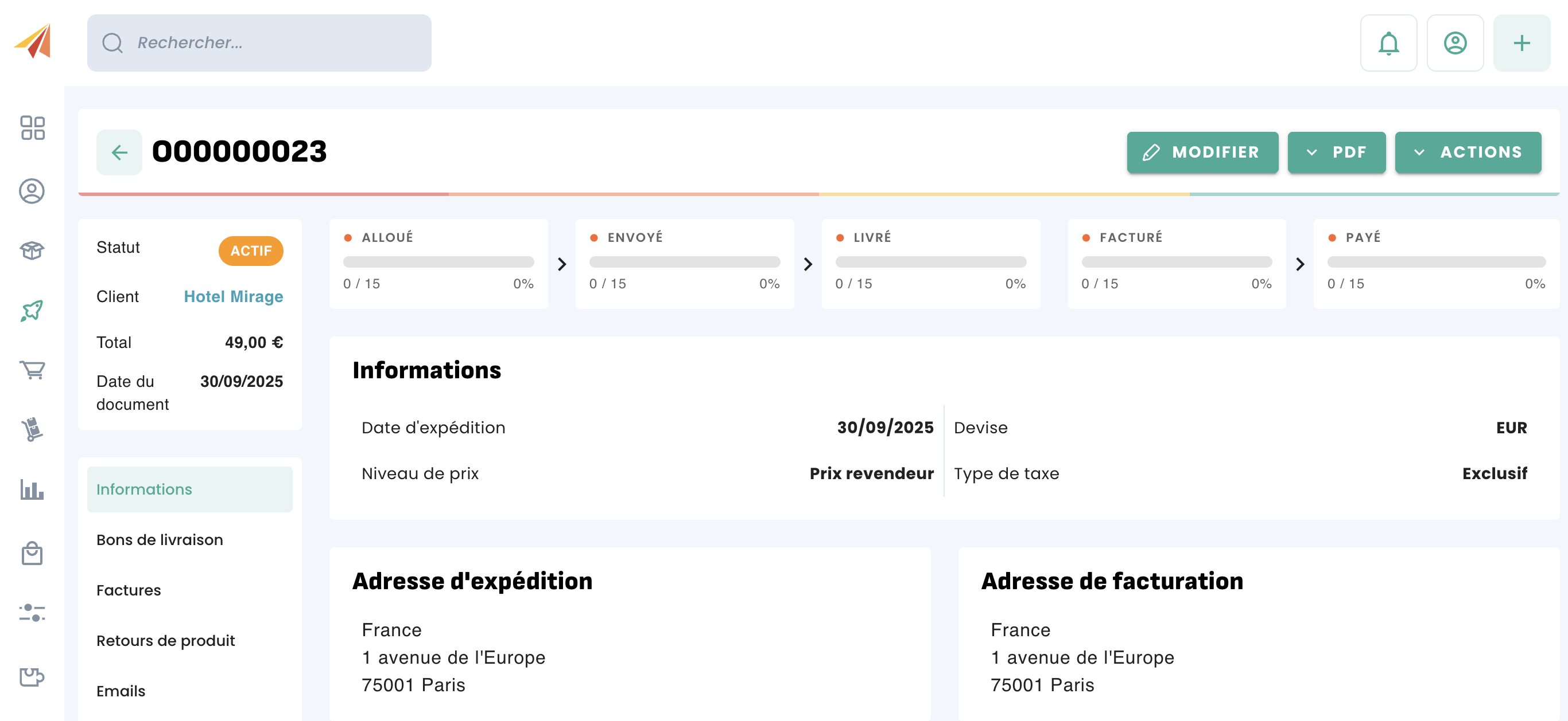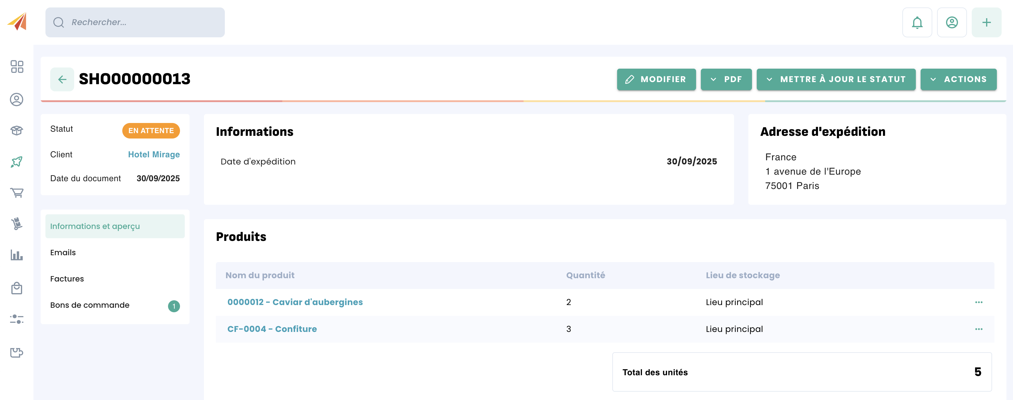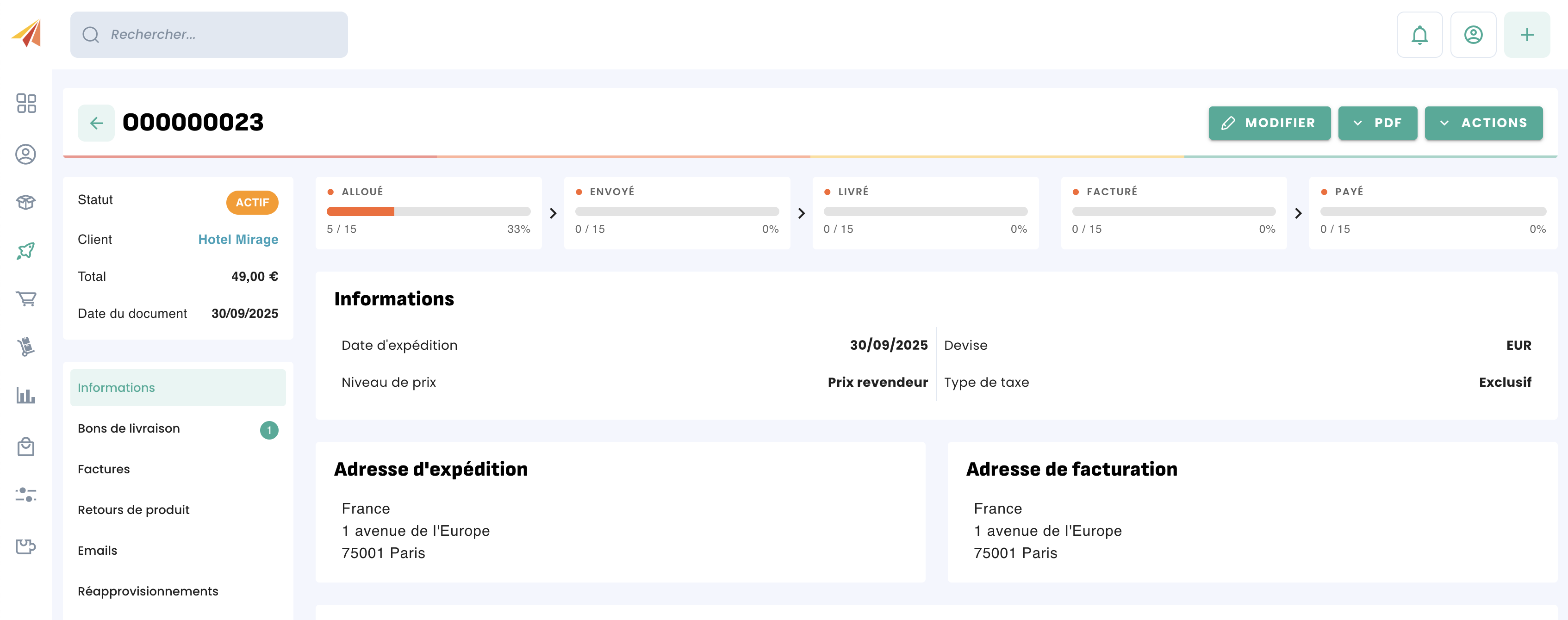 En retournant sur le bon de commande, vous pouvez alors voir la quantité de produits inscrites dans les bons de livraison, le restant à livrer et le détail pour chacun des produits dans les indicateurs en haut de la page.
