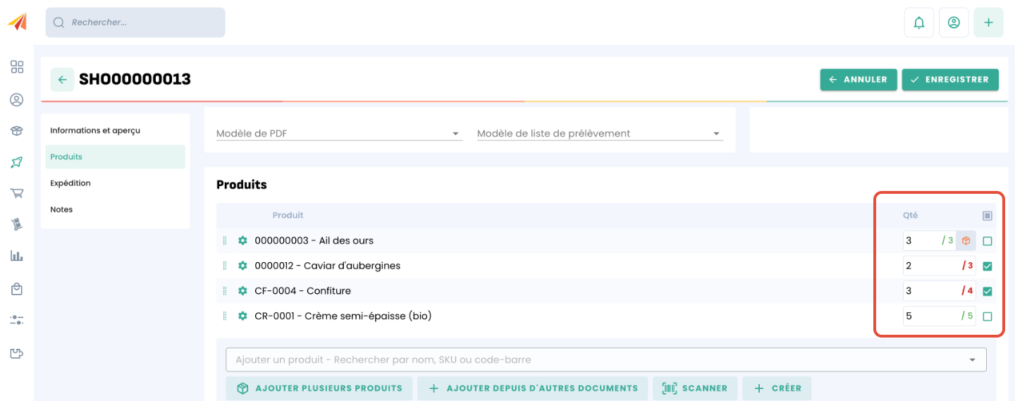 Une fois le bon de commande créé, il est désormais possible de créer un premier bon de livraison. Pour faire une livraison partielle, il suffit alors de modifier les quantités de chaque article dans ce bon, ce qui modifiera alors en direct votre stock réel. Il est également possible de retirer tout un article du bon de livraison en le décochant, ce qui peut permettre d'envoyer toute une commande sauf un article qui sera envoyé plus tard.