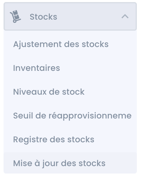 - Pour mettre à jour votre inventaire, allez simplement dans le menu "Stocks" > "Mise à jour des stocks" :