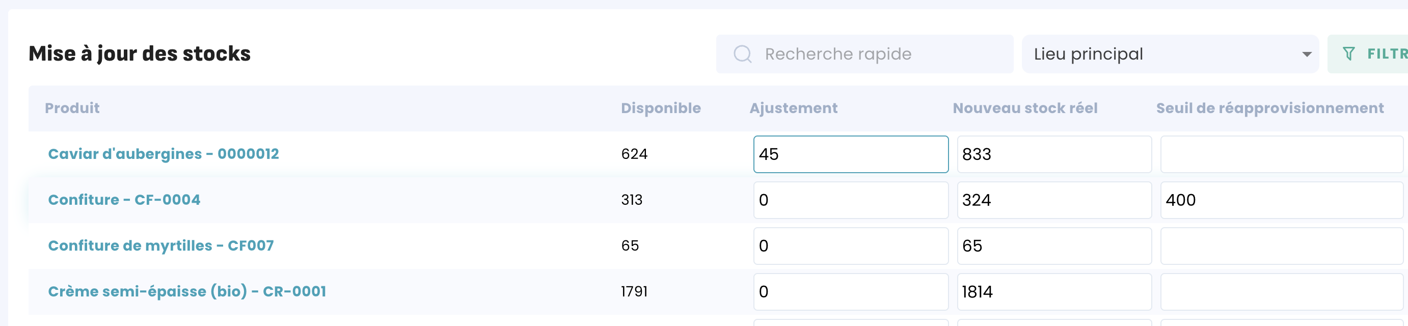Note : L'outil de mise à jour des stocks n'est pas disponible pour les produits avec suivi des numéros de lots, ces derniers demandant une trace documentaire pour justifier d'un changement, il faudra alors faire une entrée ou sortie de stock.