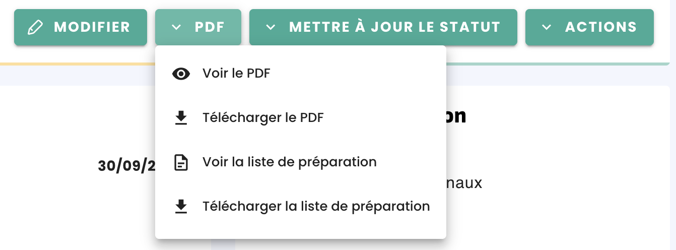 Pour créer une liste de préparation, ouvrez le bon de livraison et cliquez sur "PDF > Liste de préparation" depuis le bord supérieur droit de votre écran :
