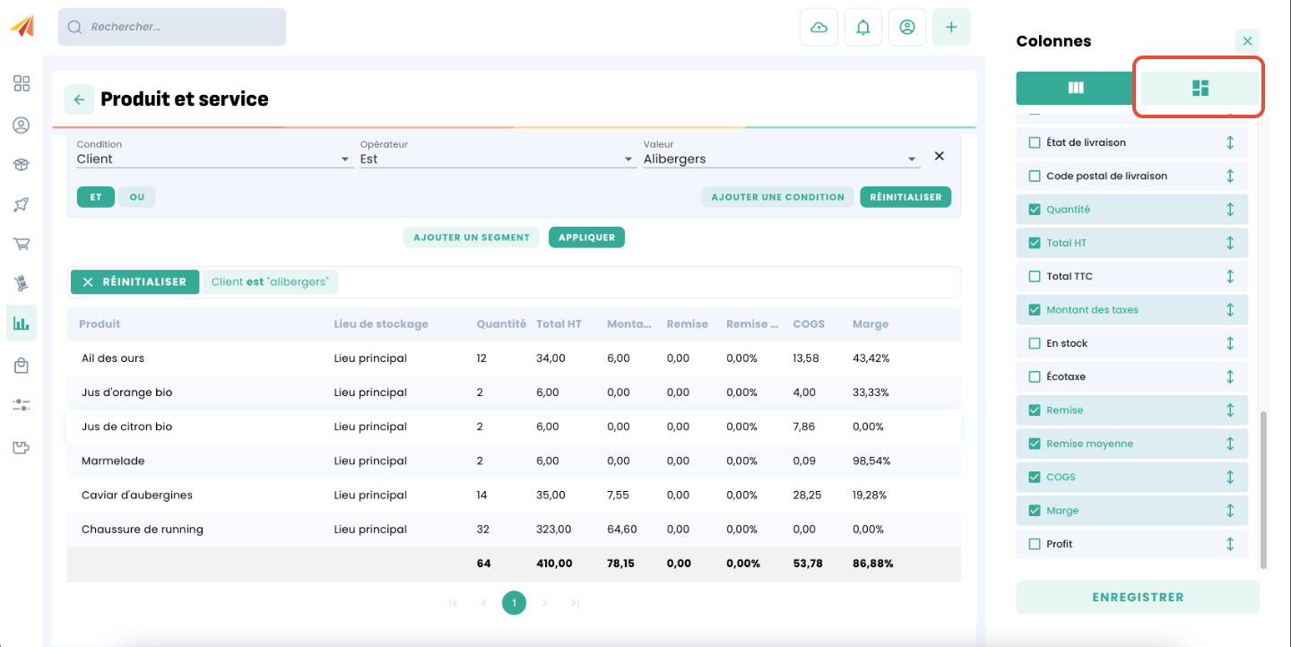 Vous pouvez personnaliser vos rapports de ventes pour accéder rapidemment aux chiffres importants pour votre activité. Choisissez les colonnes de votre rapport et sélectionnez les filtres.