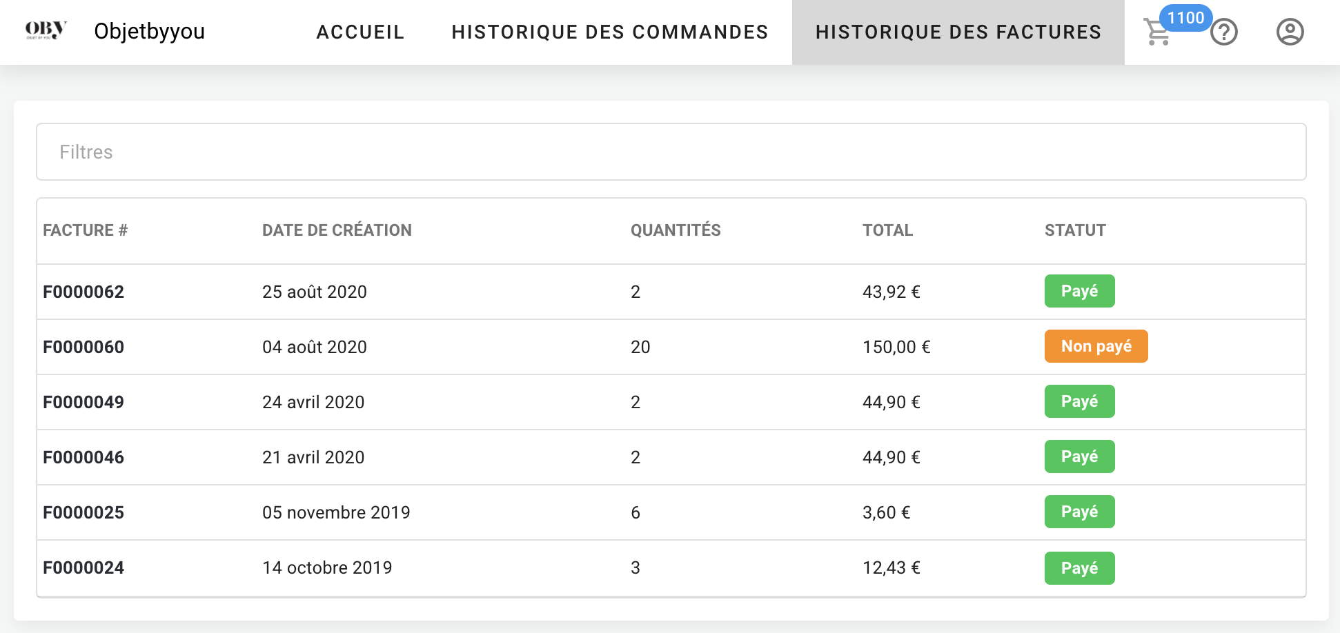 Une fois que vos clients ont accès à votre B2B Store, ils peuvent consulter l'historique de leurs commandes et de leurs factures.
