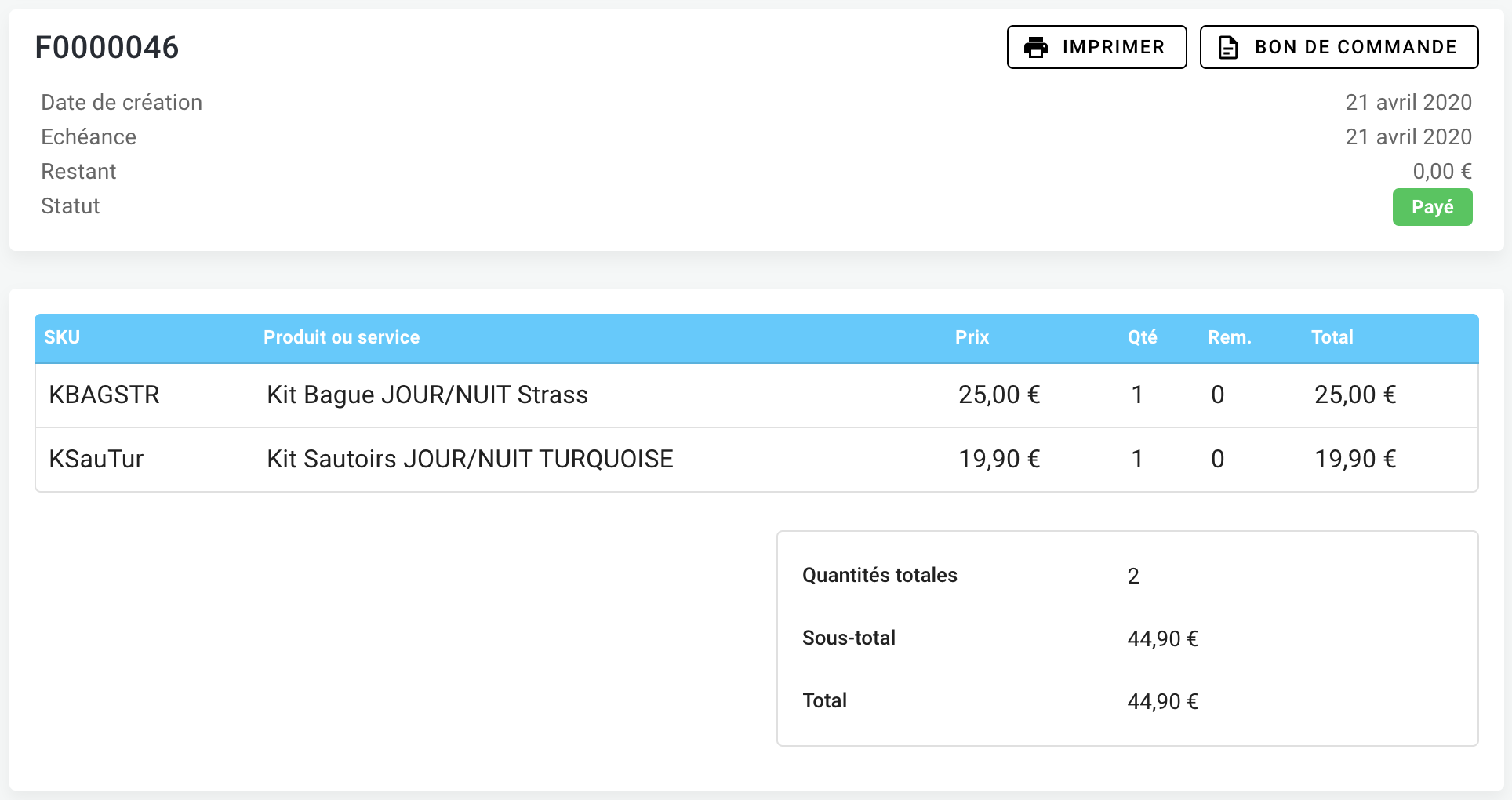 Une fois la facture ouverte, ils peuvent vérifier les détails de la facture, imprimer ou accéder à la commande client liée (le cas échéant) :