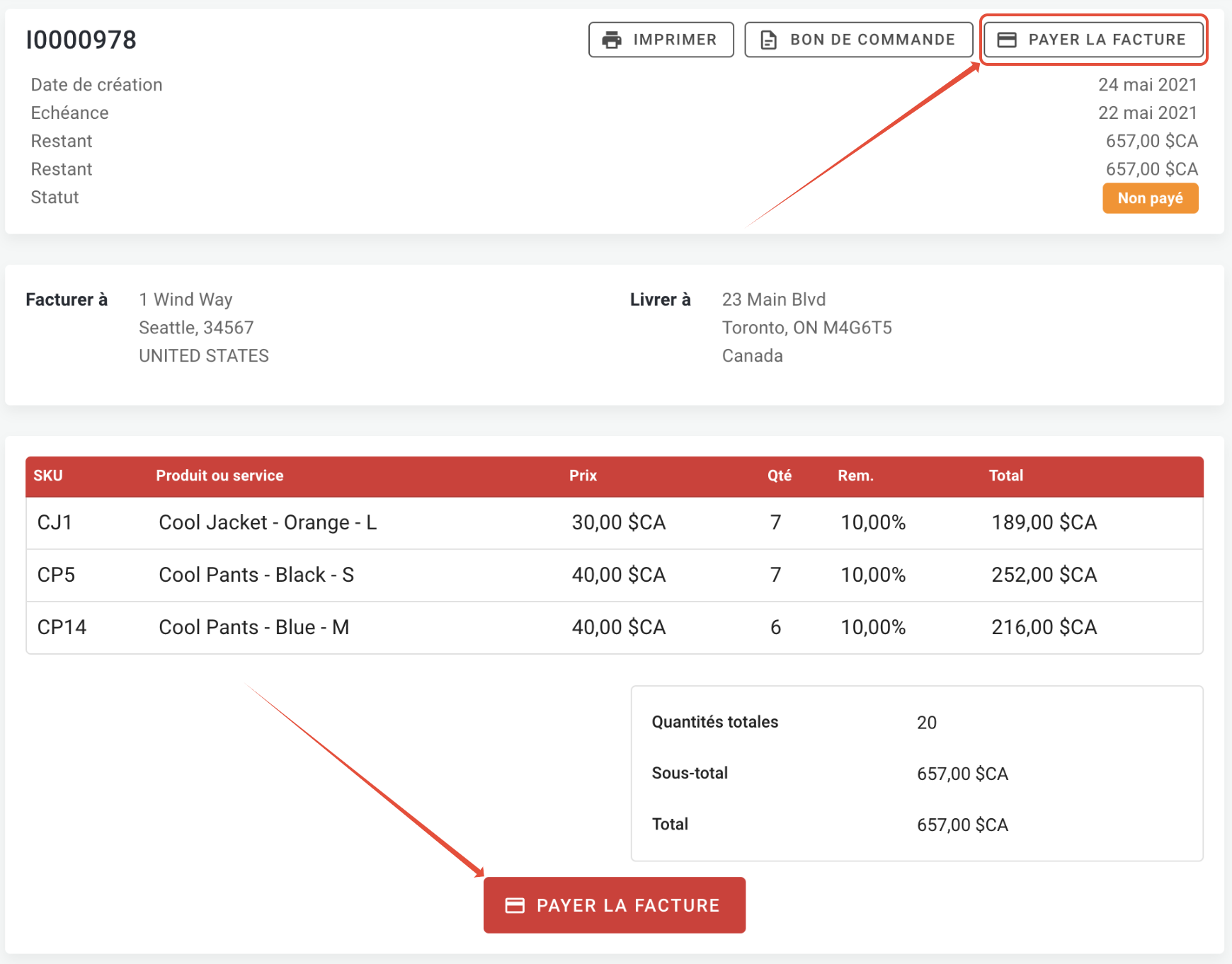 Une fois connecté avec Stripe, vos clients verront les boutons "Payer la facture" dans les factures :
