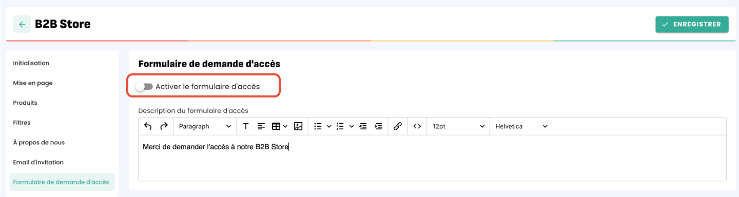 Pour activer cette demande d'accès, rendez-vous dans le menu de paramétrage de B2B Store > onglet 'Formulaire de demande d'accès'. Vous pouvez également saisir un message personnalisé qui s'affichera en haut du formulaire de demande :