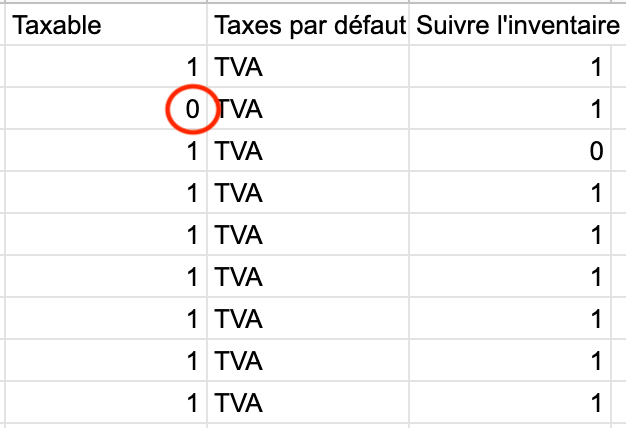 Les valeurs 1 et 0 : Dans les colonnes "Taxable" et "Suivre l'inventaire", 1 et 0 signifient respectivement OUI et NON. Par exemple, pour un produit NON-taxable, nous indiquerons “0” dans la cellule correspondante.