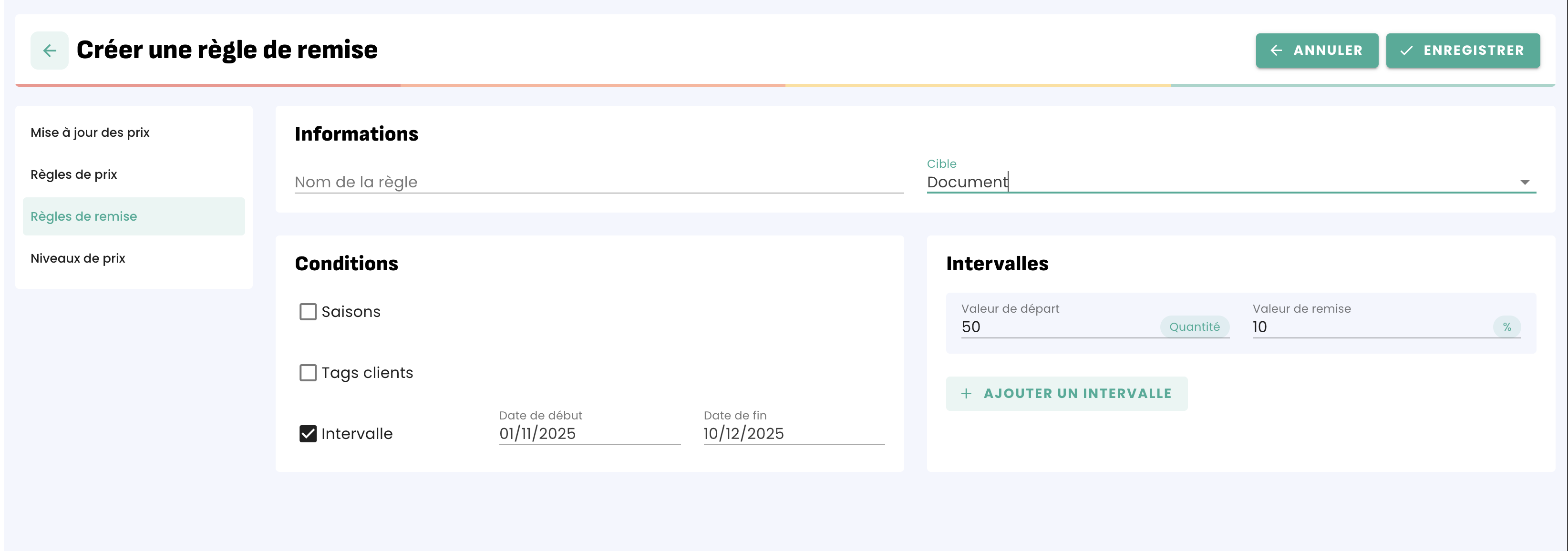Vous pouvez utiliser les règles de remises si vous souhaitez accorder des remises sur volume ou sur quantités.