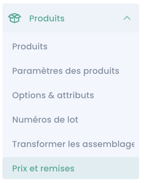Pour créer une règle de remise, allez dans le menu "Prix et remises" puis "Règles de remises".