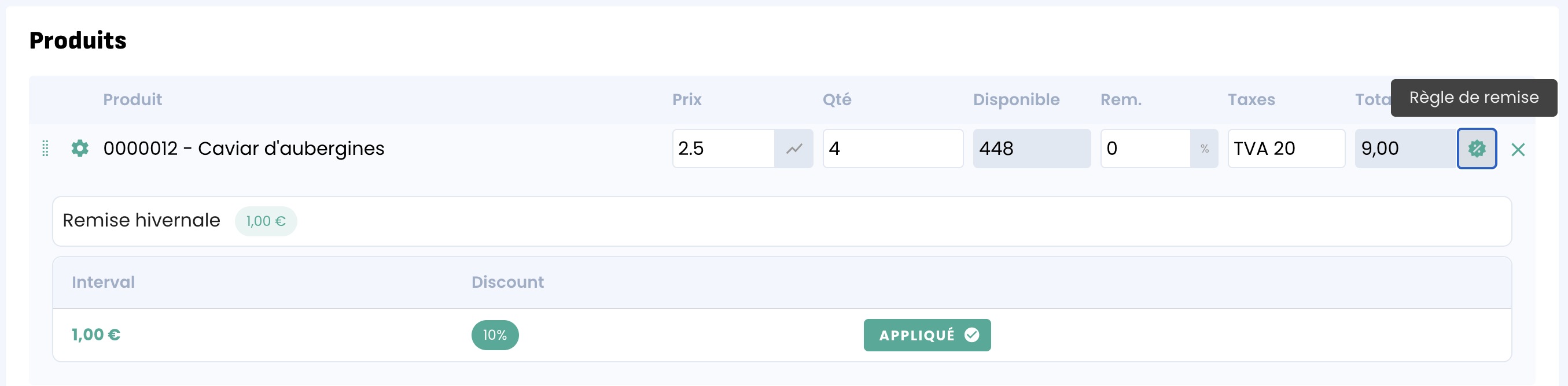 Lorsqu'un produit est affecté par une règle de remise, vous pouvez le consulter directement depuis le formulaire de création du document de vente.